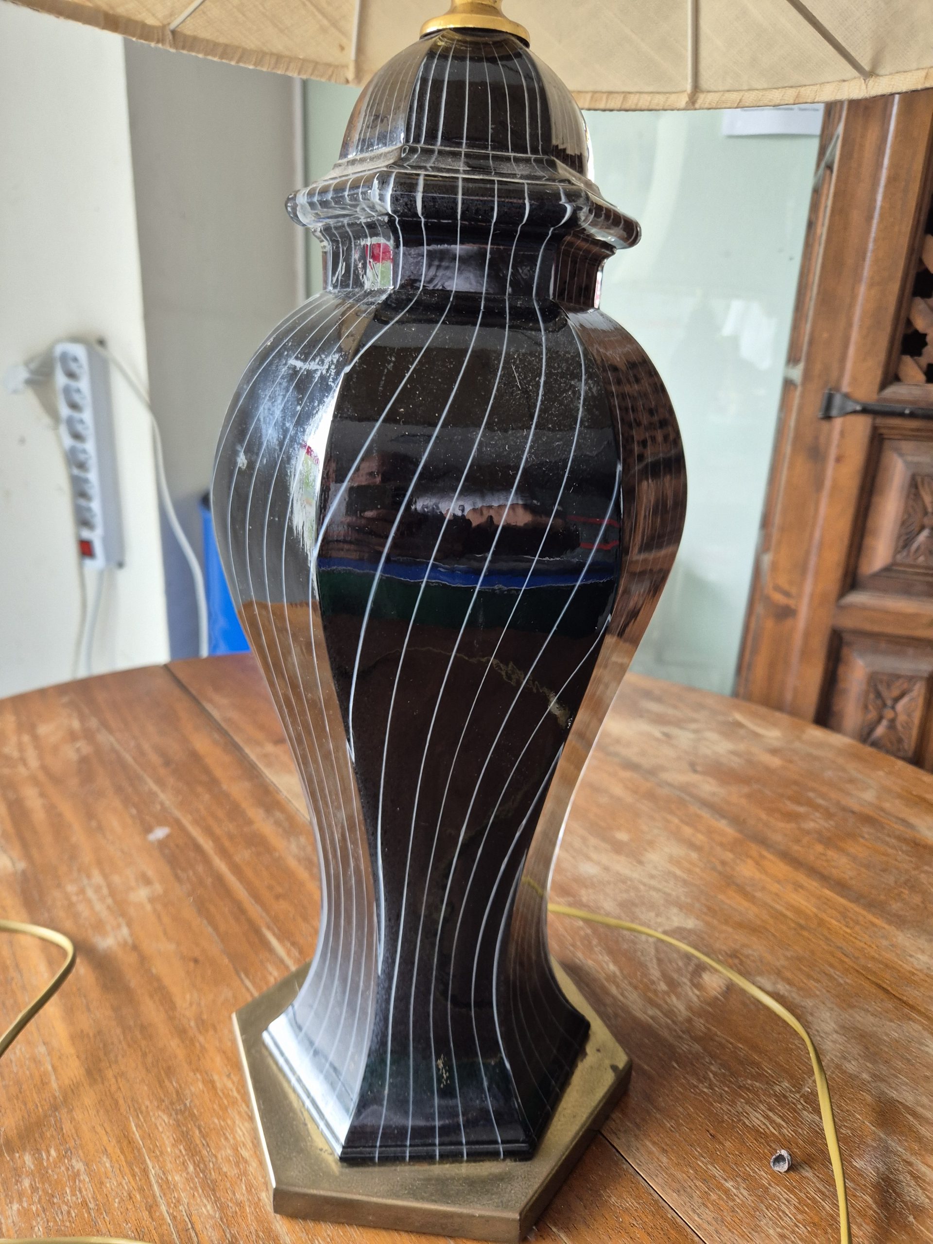 Lampada da tavolo in vetro di Murano anni 70/80 in ottime condizioni. Il vetro e di colore nero con sfumature trasparenti, la base in ottone. Volendo si potrebbe cambiare il cappello.